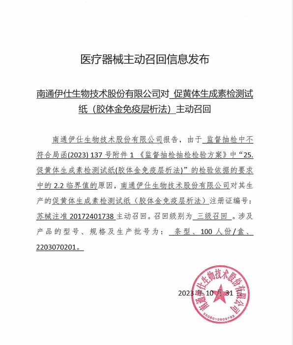 近期,南通伊仕生物技術(shù)股份有限公司生產(chǎn)的排卵檢測試紙,因第三方檢驗(yàn)判定產(chǎn)品不符合技術(shù)要求中的2.2臨界值。