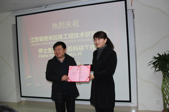 2014年3月20日,南通市伊士生物技術(shù)有限責(zé)任公司在伊士生物研究院會(huì)議室舉行了“江蘇省納米抗體工程技術(shù)研究中心、伊士生物博士后研究工作站揭牌儀式”。南通市科技局條件處 劉宏斌副處長(zhǎng),開發(fā)區(qū)經(jīng)貿(mào)局周愛群副局長(zhǎng),科技處程李榮處長(zhǎng),東南大學(xué)生命科學(xué)研究萬亞坤教授,南通大學(xué)吳啟運(yùn)教授,河南科技學(xué)院李桂榮副教授出席了這次揭牌儀式。