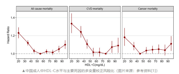 結(jié)果顯示,低HDL-C和高HDL-C均與死亡風(fēng)險(xiǎn)增加相關(guān)。該研究推薦50 mg/dL~79 mg/dL作為中國(guó)成人HDL-C的最佳范圍。正確管理低HDL-C和高HDL-C,可給血脂異?;颊邘?lái)獲益。論文指出:“該研究是第一個(gè)在近340萬(wàn)中國(guó)成人中全面評(píng)估HDL-C與全因死亡率和病因特異性死亡率之間關(guān)系的研究”。