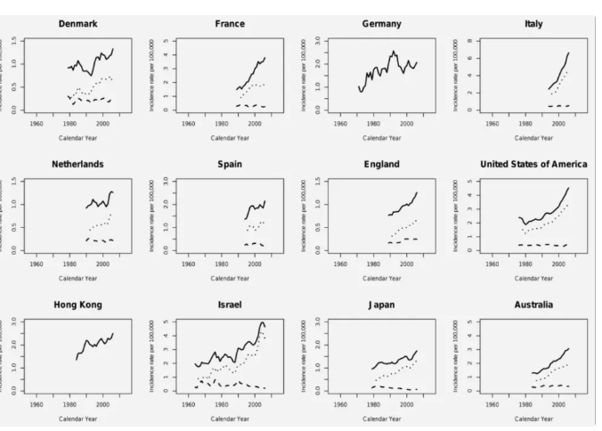 1960 年至 2007 年,在不同國(guó)家和地區(qū),男性甲狀腺癌發(fā)病率的總體趨勢(shì)呈明顯上升,圖片來源:參考文獻(xiàn)[4]