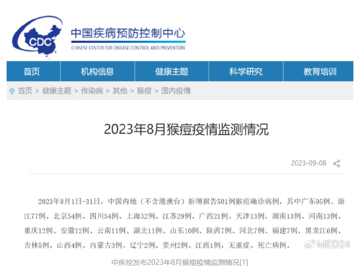 9月8日,中疾控發(fā)布8月猴痘疫情監(jiān)測情況[1]。2023年8月1日-31日,中國內(nèi)地(不含港澳臺)新增報(bào)告501例猴痘確診病例,相較7月增加10例。